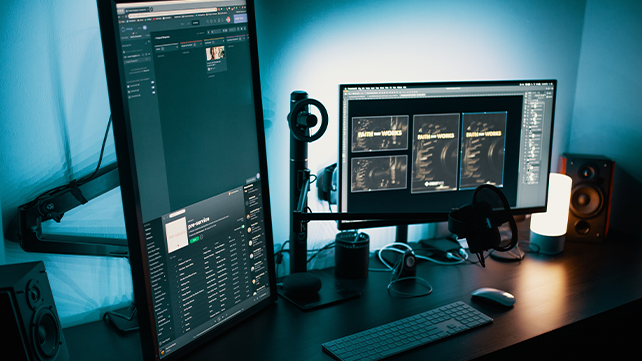 Content creators can collaborate on multiple windows through a docking station, use a PSSD to access more material at the same time, and to prevent data loss, upload to NAS for backup storage.